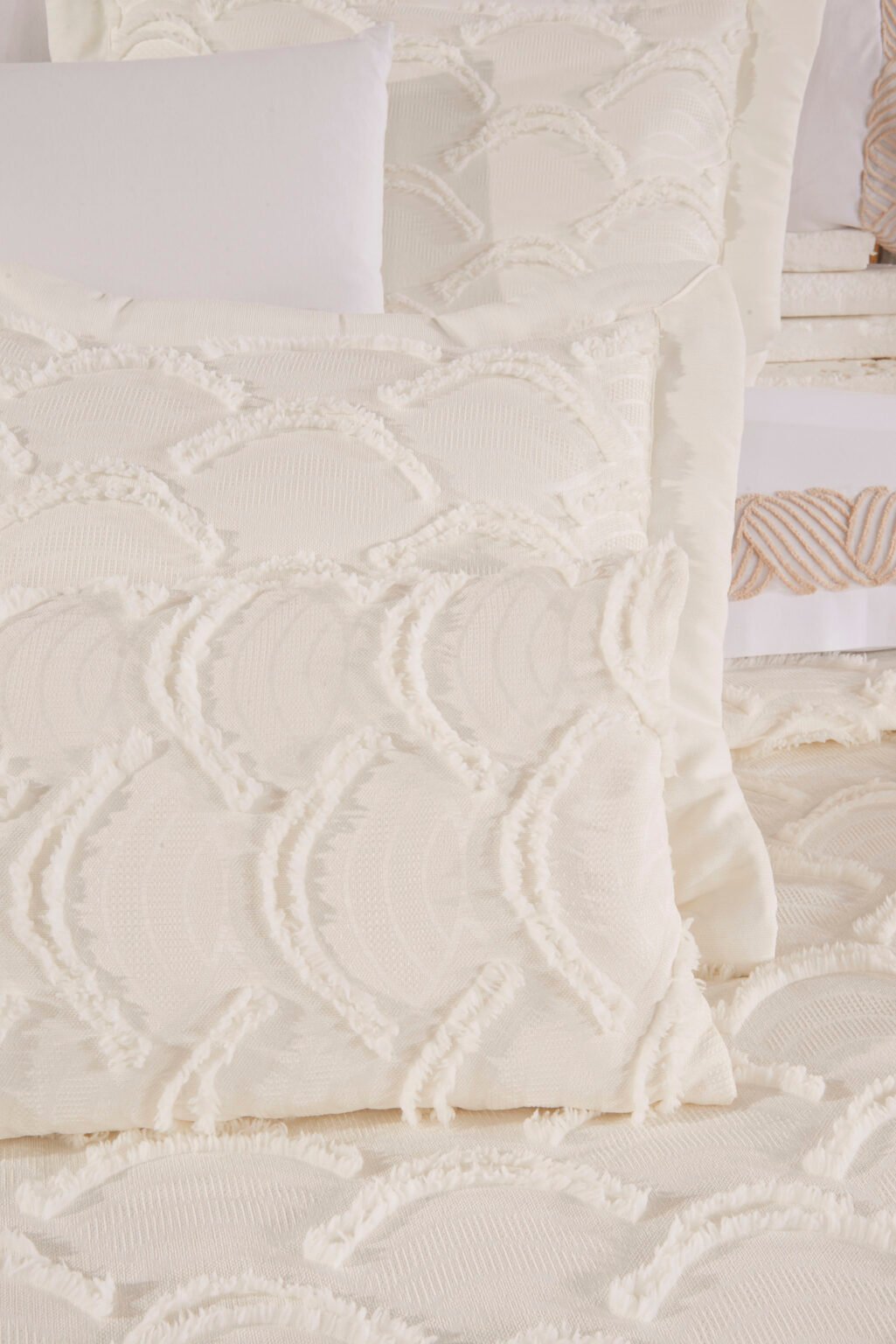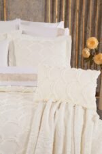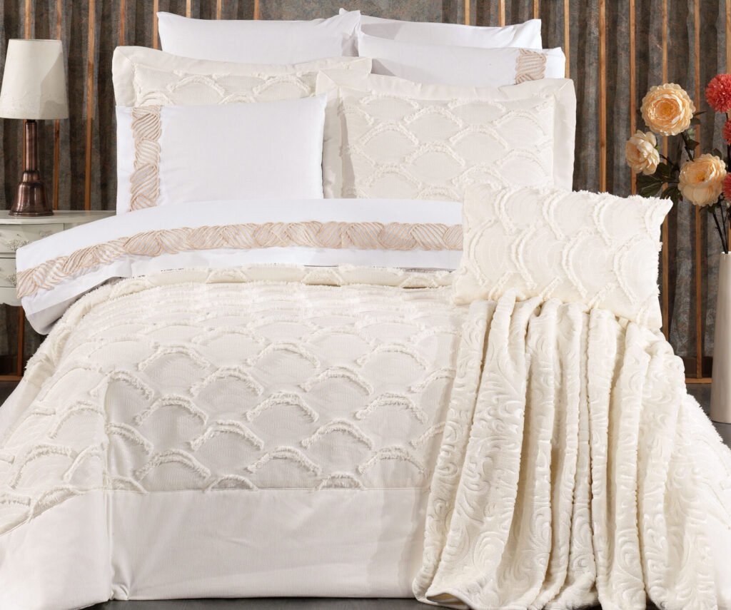 Set içerisinde yer alan yatak örtüsü, nevresim takımı ve yumuşacık battaniye, birbirleriyle tam uyumlu renk ve desenlerden oluşur. 6 adet yastık kılıfı (dantelli, desenli ve pano) ile yatağınızda katmanlı ve lüks bir otel konforu oluşturabilirsiniz.