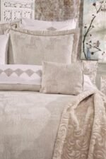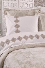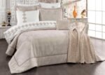 Set içerisinde yer alan yatak örtüsü, nevresim takımı ve yumuşacık battaniye, birbirleriyle tam uyumlu renk ve desenlerden oluşur. 6 adet yastık kılıfı (dantelli, desenli ve pano) ile yatağınızda katmanlı ve lüks bir otel konforu oluşturabilirsiniz.