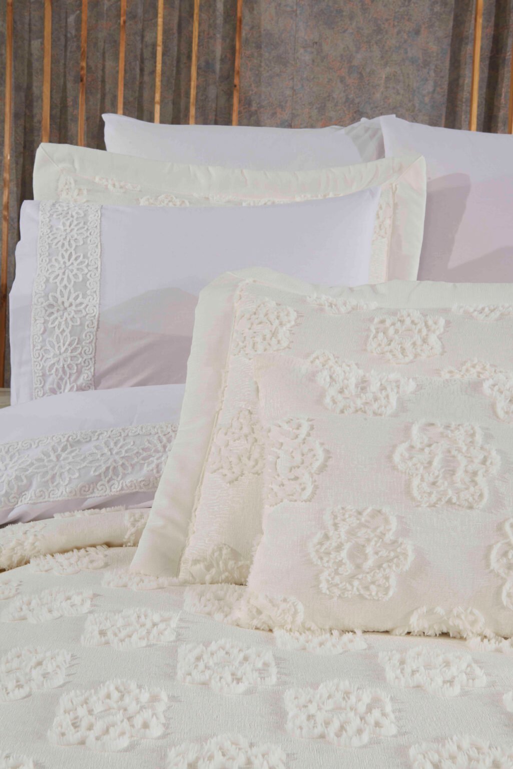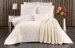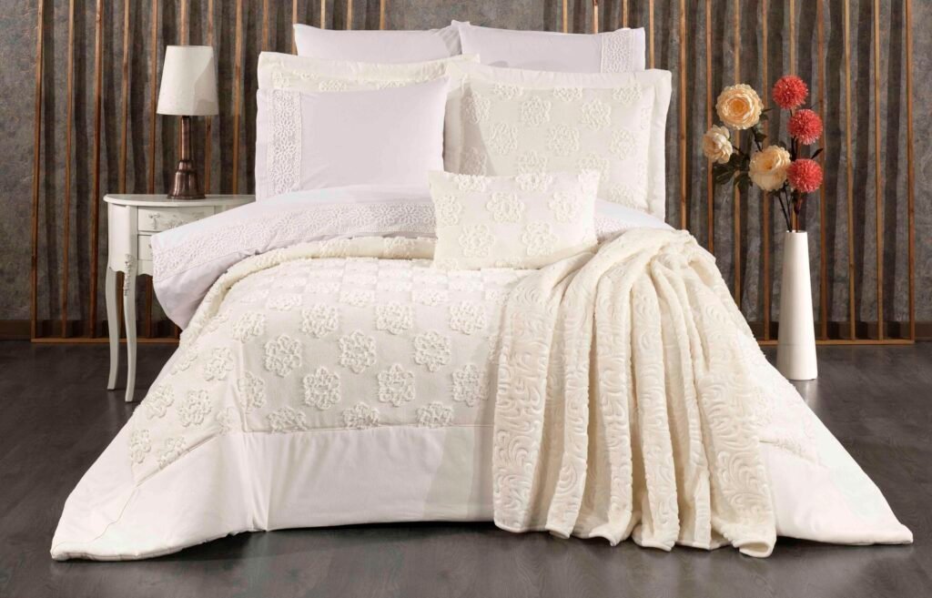 Set içerisinde yer alan yatak örtüsü, nevresim takımı ve yumuşacık battaniye, birbirleriyle tam uyumlu renk ve desenlerden oluşur. 6 adet yastık kılıfı (dantelli, desenli ve pano) ile yatağınızda katmanlı ve lüks bir otel konforu oluşturabilirsiniz.