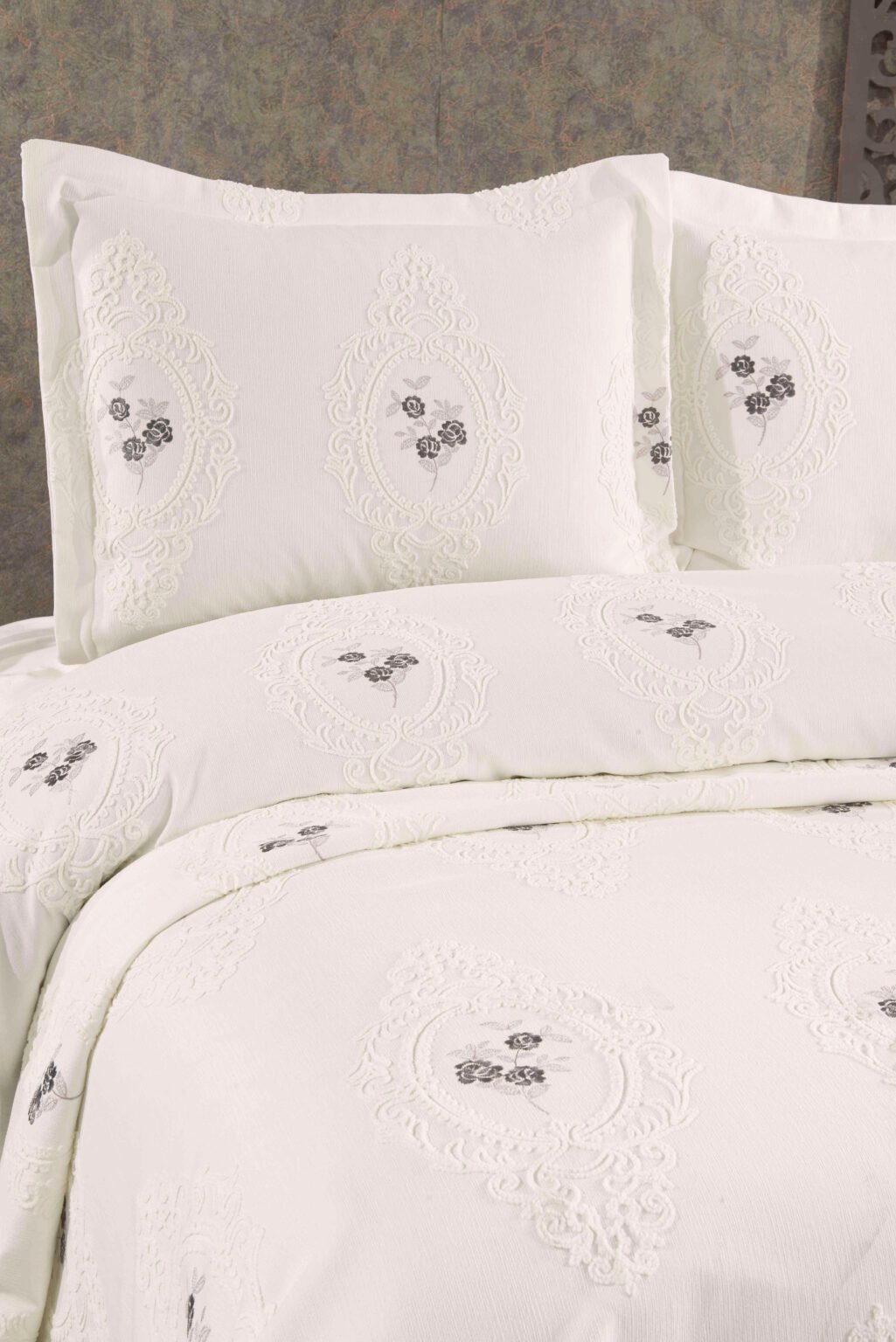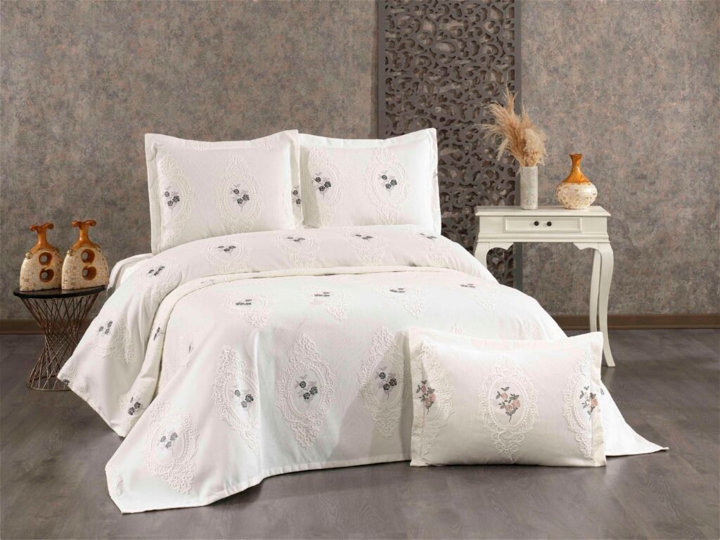 Çeyizlerin en zarif ve kullanışlı parçalarından biri olan Viorra Collection Jakarlı Pike Takımı, yatak odanızın dekorasyonuna asil bir dokunuş katmak için tasarlandı. Jakar dokuma tekniği ile kumaşa işlenen kendinden desenli motifler, yatak odanıza derinlik ve zengin bir görünüm kazandırır.
